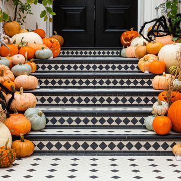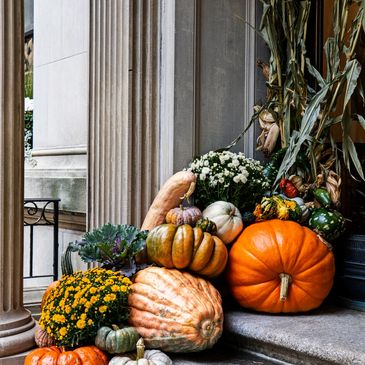Pumpkin Dispatch is a pumpkin delivery and design company serving Central Illinois. This means we deliver pumpkins (a lot of them!) to your home or business and set them up in a beautiful display, typically on your front porch or around your front door. We also have mums, hay bales, and corn stalks that can be added to any package to elev